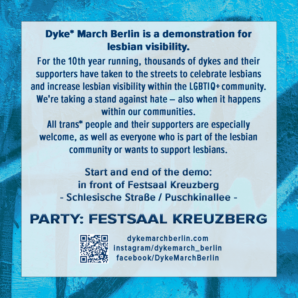 Diesen Freitag, 21. juli, 18:00 Uhr treffen wir uns endlich wieder auf der Strasse! Die Demo started und endet direkt vor dem Festsaal Kreuzberg. Dieses Jahr feiern wir dort 10 Jahre Dyke* March Berlin mit der Abschlussparty „Dykes* Do It Better!“.