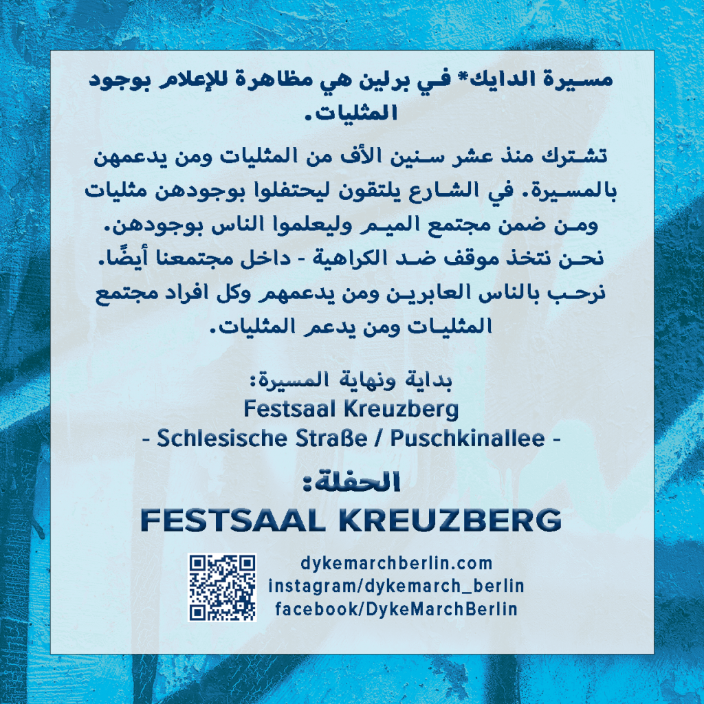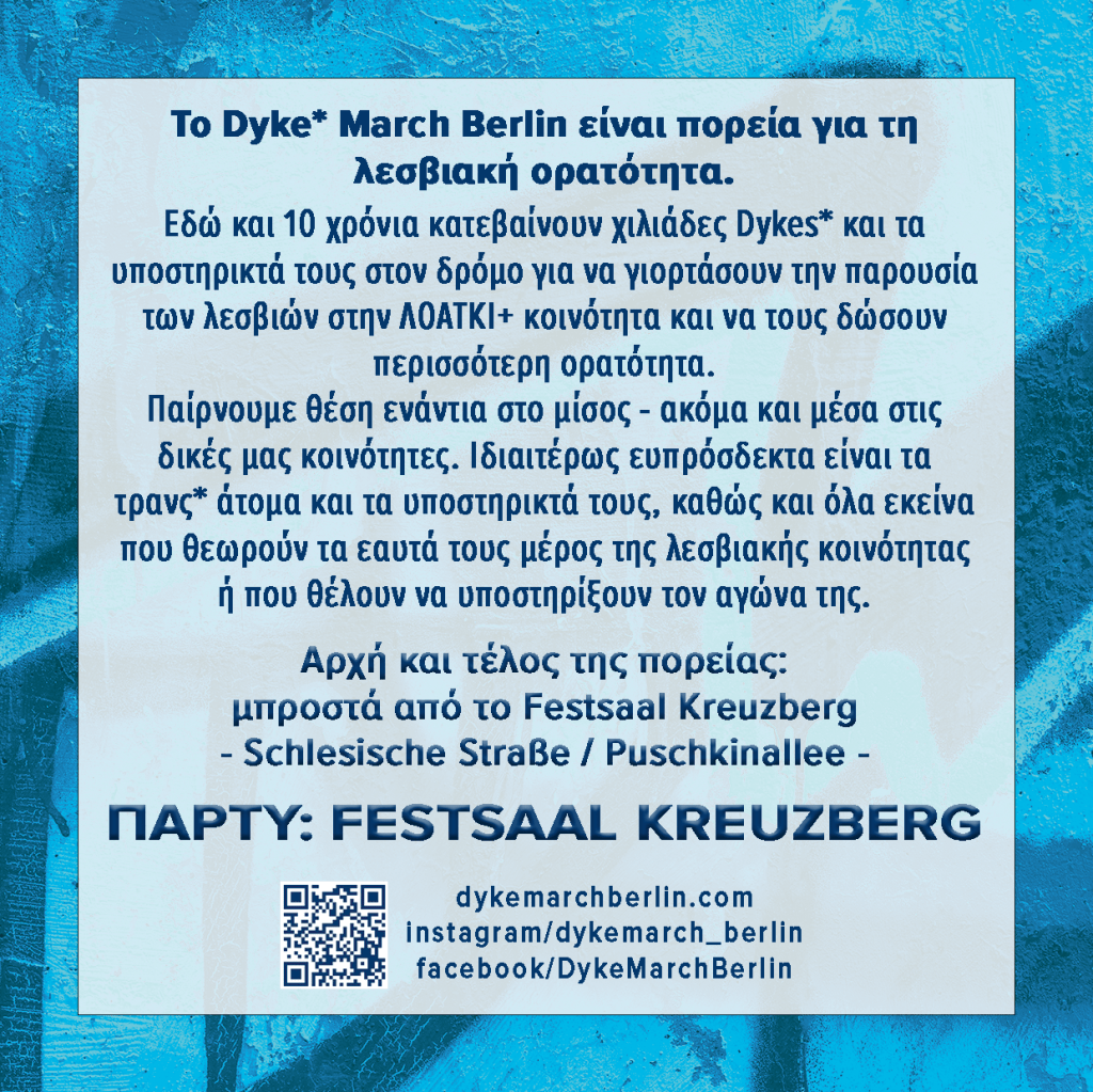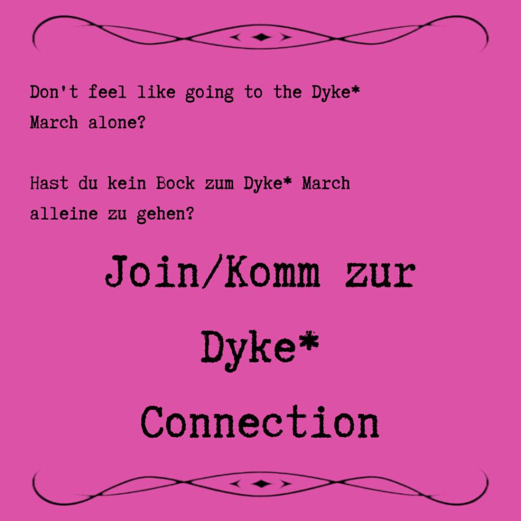 Wenn du kein Bock hast, allein zum Dyke* March zu kommen, komm 15 Minuten vor Beginn der Demo zu Dyke* Connection! Triff andere Dykes* und lauft gemeinsam für lesbische Sichtbarkeit ✊🏽✊🏿✊🏻 Eleni (keine Pronomen, abrasierte Haare, mit einem Schild mit der Aufschrift „Dyke* Connection“) wird um 17:45 Uhr direkt neben unserem roten Lautsprecherwagen auf dich warten.