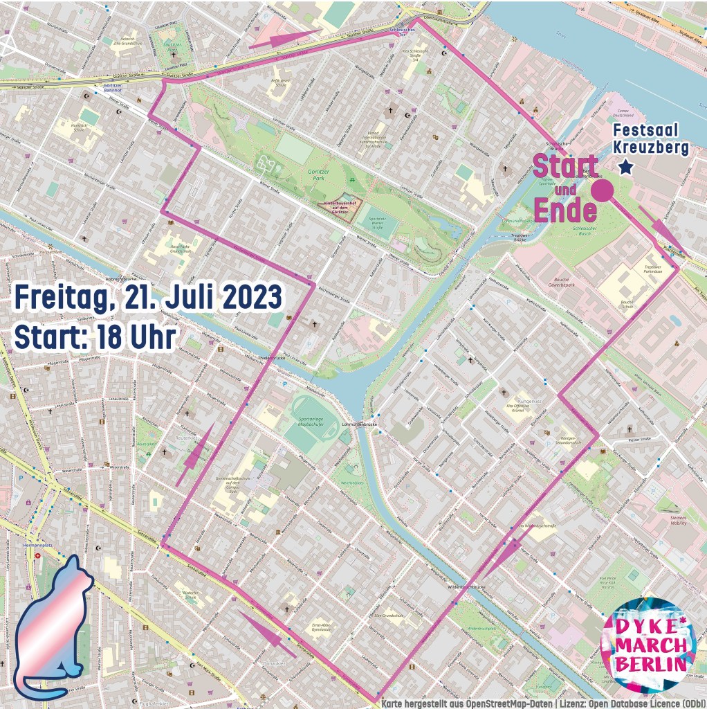Mit vollem Tank & gern geschmückt mit lesbisch/queeren Flaggen & Parolen & Outfits (Safety first) – seid sichtbar! Bitte kommt zwischen 17.30/17.45 Uhr zur „Startaufstellung“ – es wird für uns eine Sperrfläche (Parkzone) gegenüber Festsaal Kreuzberg zur Verfügung stehen – in Fahrtrichtung (zum Treptower Park)