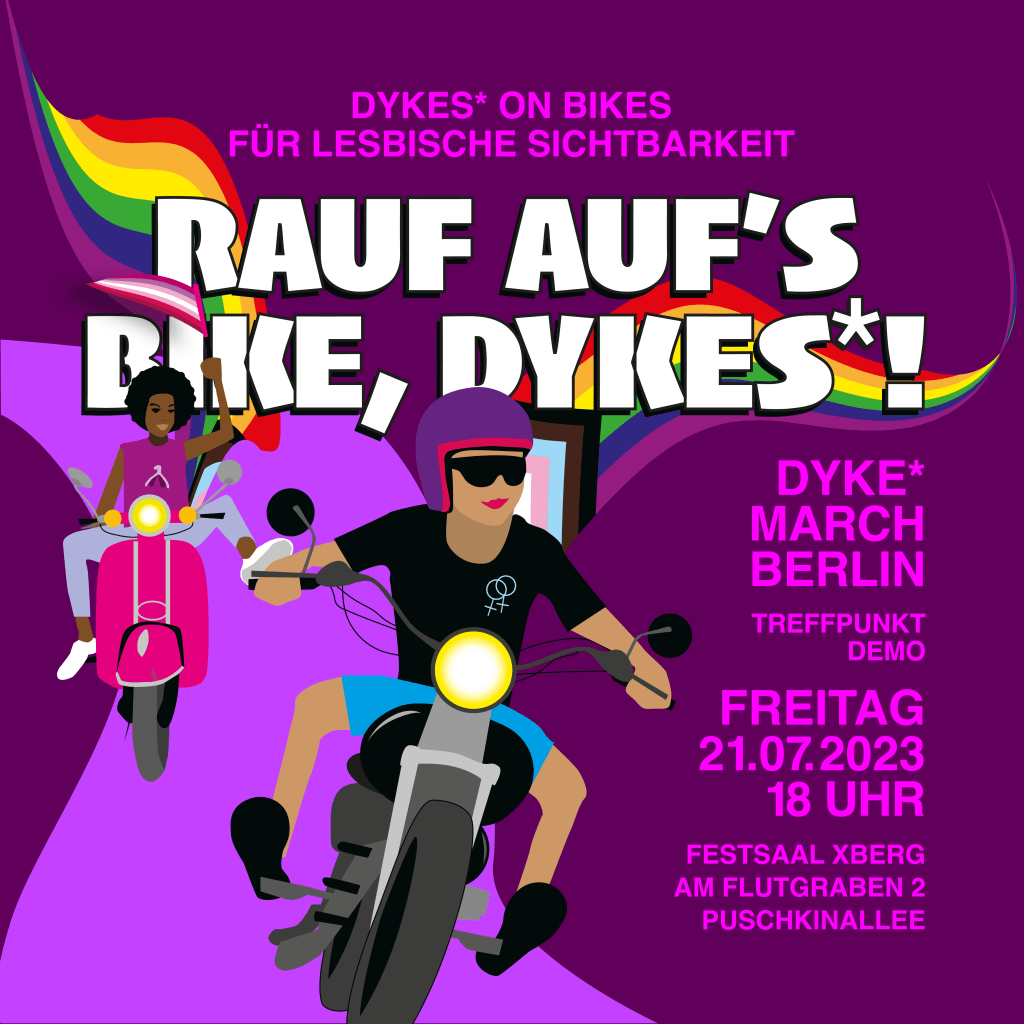 What would a DYKE*MARCH be without the great „DYKES* ON BIKES“ at the head of the demo…. So – polish up your bikes, swing on your cross bike or even on a scooter and become part of the bikers at the DYKE* MARCH.